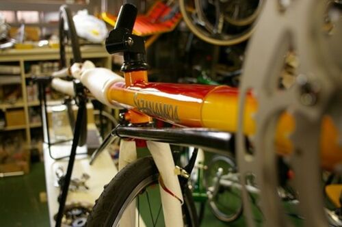 A氏のSAZANAMIである。 ハンドルが遠い不満をアイデアと加工で工夫した仕様である。 街チャリコーナー替わりに工房日記でご紹介。 ハンドルの角度やバーエンドバーの装着方法は参考になる。 リアビュウもスッキリとまとまっている。 バーエンドバー…